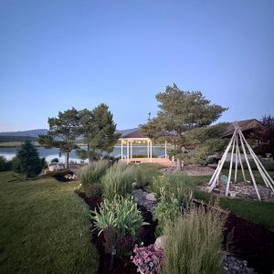 The venue features a variety of both indoor and outdoor spaces to accommodate different parts of the wedding day. Couples can exchange vows on the famous dock, celebrate under the twinkling lights of the dance hall, or gather with loved ones in the charming gazebo. A bridal cottage and groom’s den provide comfortable, private spaces for getting ready, while the fire den and bonfire create cozy spots for evening gatherings. Juniper Ridge also offers overnight accommodations, from camper trailers and tents to large furnished teepees, allowing couples and their loved ones to celebrate late into the night.